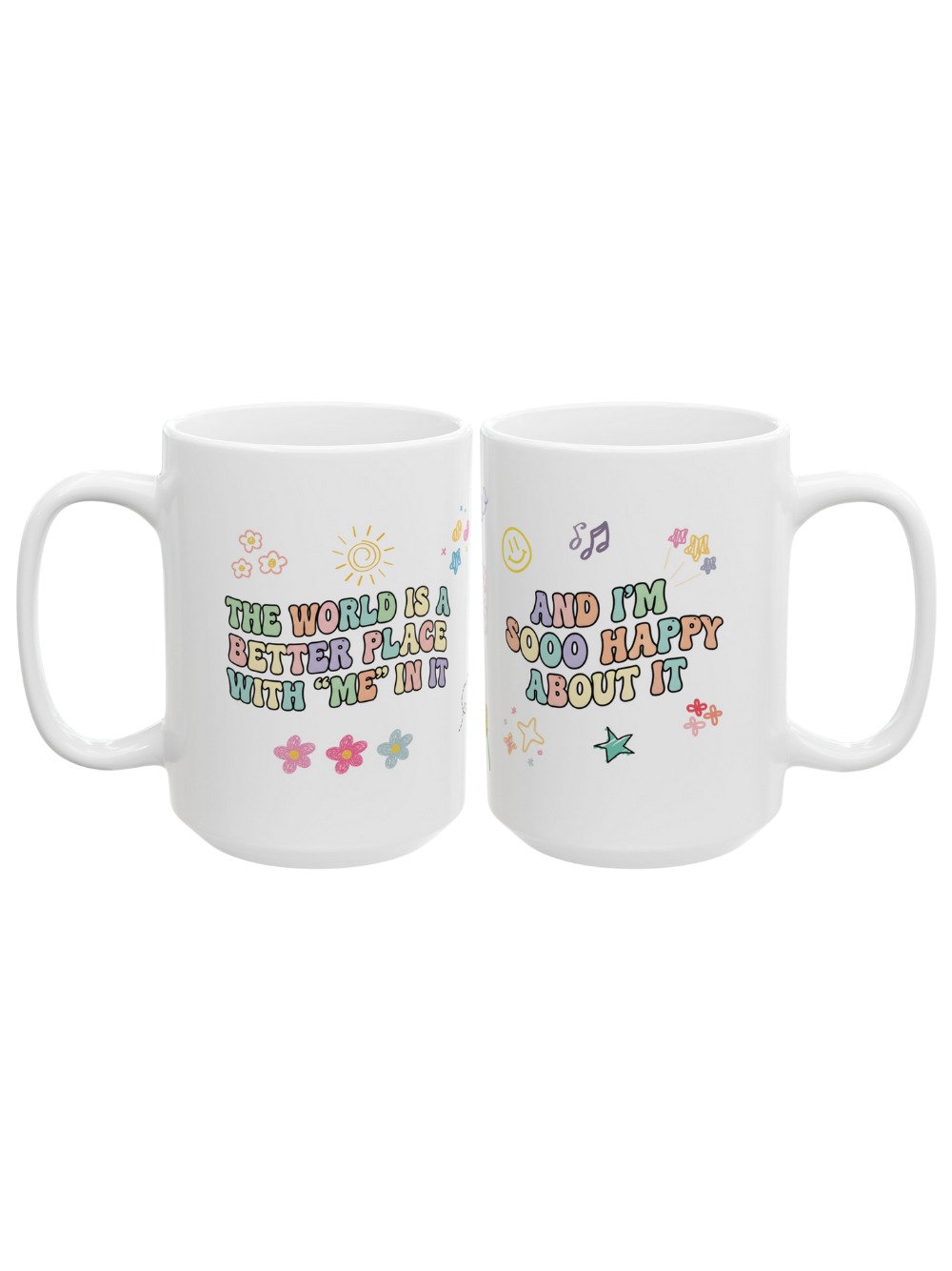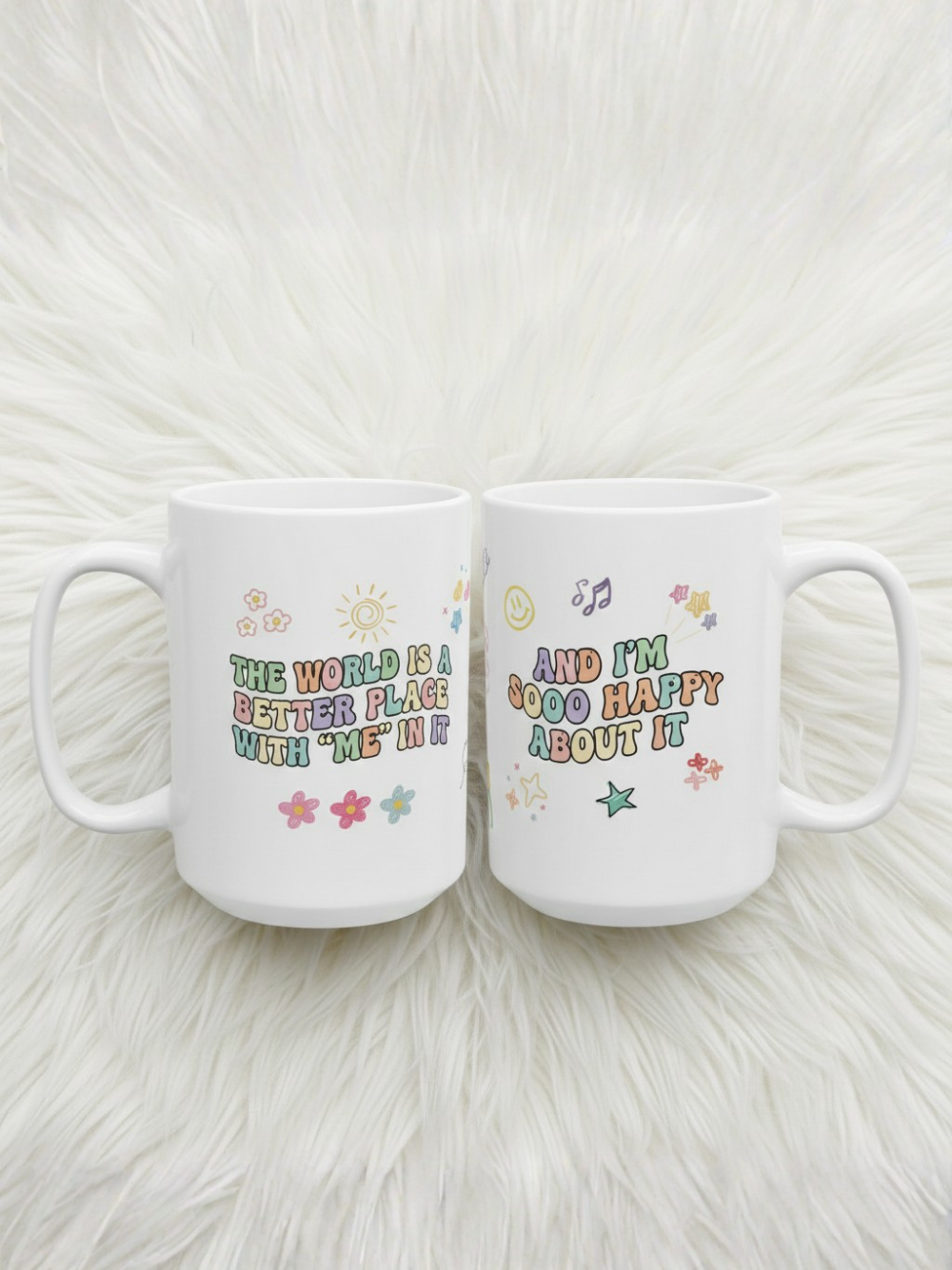 Positive Vibes Ceramic Mug — "The World Is A Better Place With Me" Message Coffee Cup (11oz, 15oz)